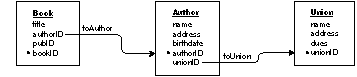 Nested Relationships A DBExpression can traverse nested to-one relationships. For example, the following message initializes a DBExpression to represent the address of the union to which the author of a particular book belongs. The model upon which this is based is shown in Figure 78. |