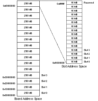 | Warning: | The addresses 0xs200c000 to 0xs200cfff, where s is 2, 4, or 6, are intercepted by logic on the CPU board; some CPU boards also intercept addresses 0xs1000000 to 0xs1ffffff, where s is 2, 4, or 6. Writing to these intercepted addresses can cause errors. If your driver needs access to information at these addresses, your board must be configured to accept addresses for the next higher slot, as described in the gray box later in this chapter. | |