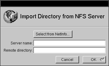 | 1. | Still in NFSManager, choose Import To from the main menu. The Select NetInfo Domain panel appears. |